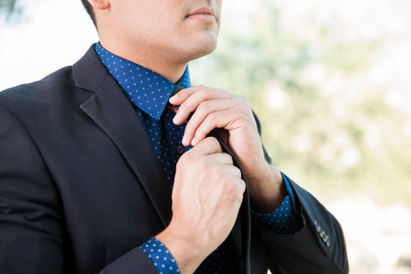 close up of a man fixing his tie knot. Fashion and elegance concept