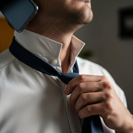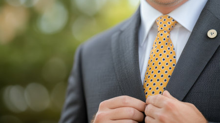 A person in a dark suit is adjusting their tie, preparing for a formal event or meeting. The setting suggests professionalism and attention to detail in appearance.