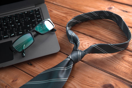 glasses on laptop and tie on the table