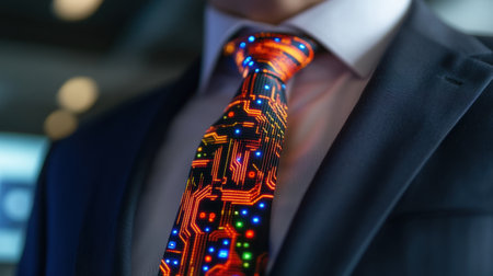 Close-up of businessman neon tie resembling computer circuits, futuristic styling all around