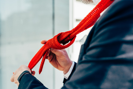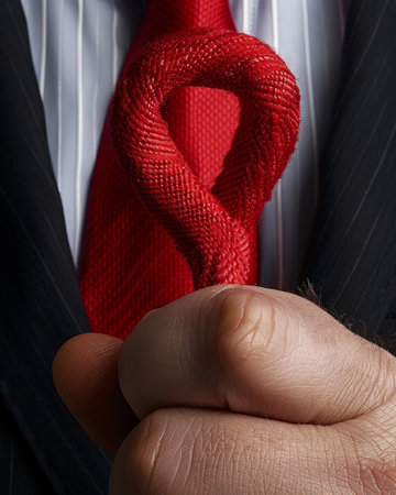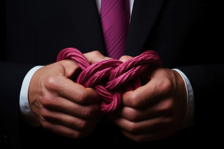 Close-up of a hand tightly gripping a red rope, symbolizing power, control, and business attire. The background shows a suit with necktie and shirt, emphasizing a professional context.