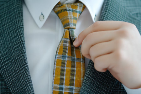 A professional in a sharp suit fine-tunes a vibrant, striped accessory, exuding confidence and style, ready for a formal or corporate setting.