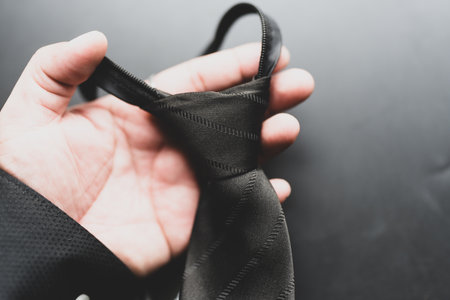 A man is holding a black tie in his hand