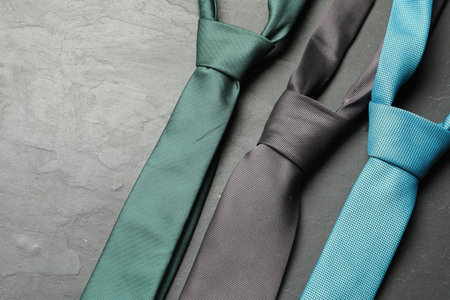 Different neckties on gray textured table, flat lay