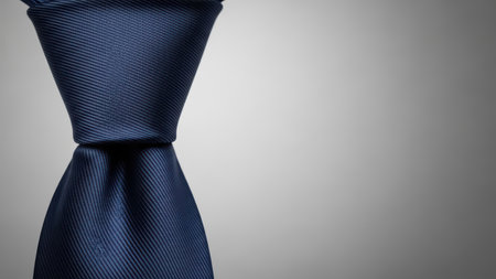 High-quality close-up of a rich navy blue woven silk tie, expertly tied in a symmetrical Windsor knot, perfect for professional settings, weddings, or upscale events. Crisp texture and refined elegance.