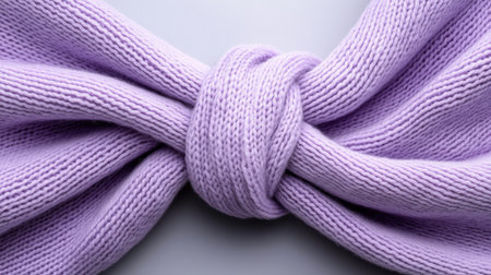 A purple scarf is knotted in a bow. The scarf is knotted in a way that it looks like a bow