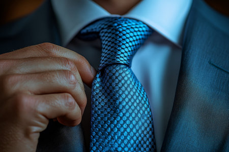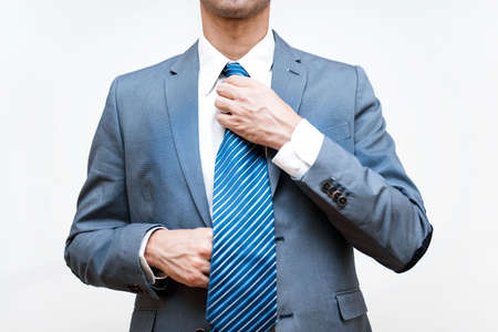 play the role of being an a businessman in a white shirt is fixing a blue tie