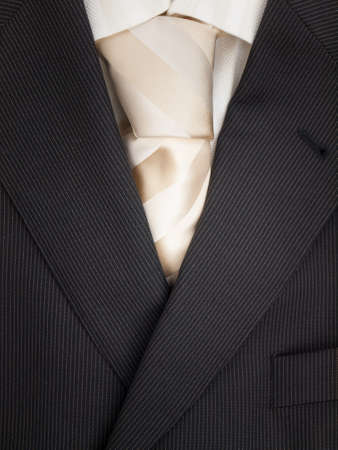 detail of mens pinstripe suit jacket with shirt and light cream coloured striped tie