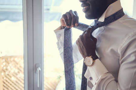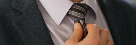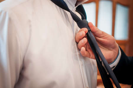 close up of a man fixing his tie knot. Fashion and elegance concept