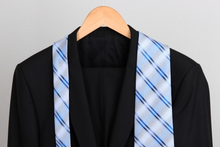 Close-up of a gray jacket with white blue checkered shirt, striped tie and maroon handkerchief on black background Clipping path included