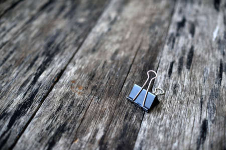 Closeup black paper clip on light wooden surface. Stationery.