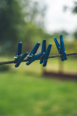 4 Blue Clothespins Hanging on a rope. Clothespins for linen