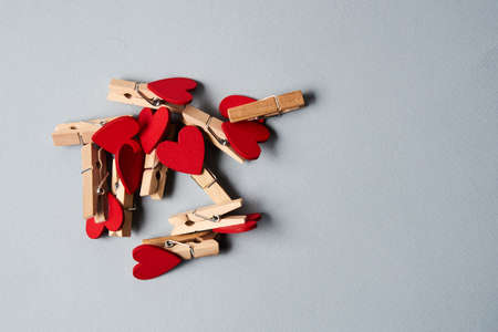 Clothespins with wooden hearts at the end on a gray background Valentines day holidays decoration