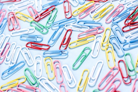 Paper clips of different colors used in the office.