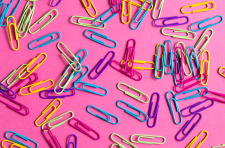 Top view of colorful paperclips on pink background. School, office wallpaper. Flat lay, copy space.