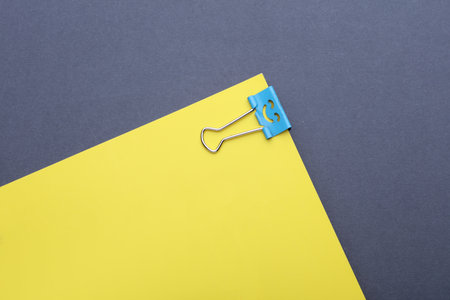 Binder clip with a smiling face and yellow notebook on dark gray background