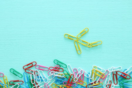 concept image of creativity or think outside the box. paperclips forming an airplane, teamwork and different mindset.