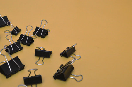 Black paper clips on a yellow background. Copy space for text.
