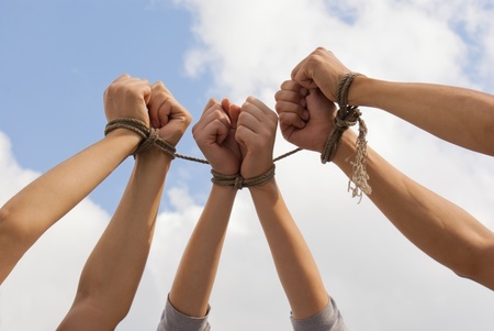 Black and white image of clenched fists bound with coarse rope, representing physical abuse and captivity