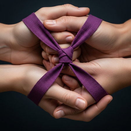 A diverse group gathers, placing hands together in a symbol of unity and support during a community event in the evening atmosphere, promoting togetherness.