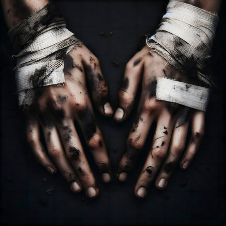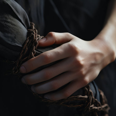 Closeup of hands bound with rope capturing emotions and vulnerability. Detailed view of tied hands symbolizing captivity, restraint, and human emotions