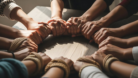 Generative AI close-up shows a group of unidentified persons piling their fists on top of one another