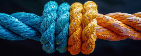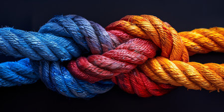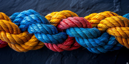 Vividly colored ropes intricately knotted showcasing strength, unity, and complexity. Colorful knotted ropes symbolizing strength, unity