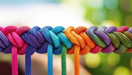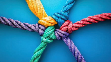 Diverse strength united in teamwork, colorful ropes forming a network on a unified background.