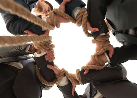 Hands of people pulling the rope cooperation concept. business team using a rope as an element of the teamwork.