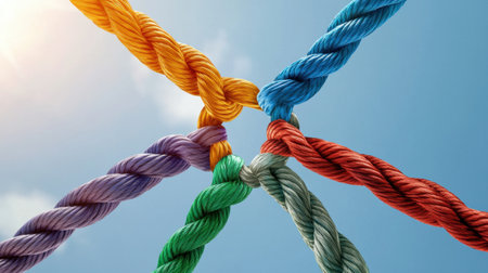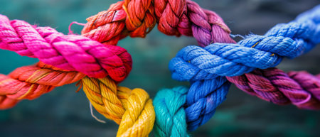 Intertwined ropes of diverse colors symbolize unity and synergy in teamwork, forming a strong, cohesive bond.