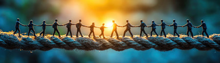 A glowing bridge of light symbolizes empathy, connecting people hand-in-hand Bathed in gold, figures walk a rope, representing teamwork and unity This inspiring image showcases trust and collaboration, highlighting the interconnectedness needed to achieve common goals It's a powerful visual metaphor for human connection AI Generative
