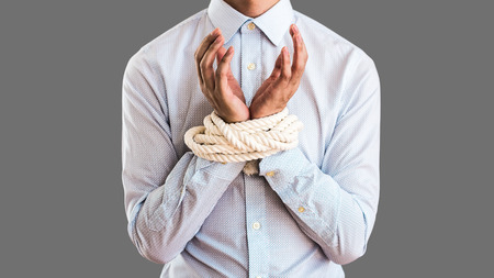A close up of a man in a suite with his hands tied up with red tape.