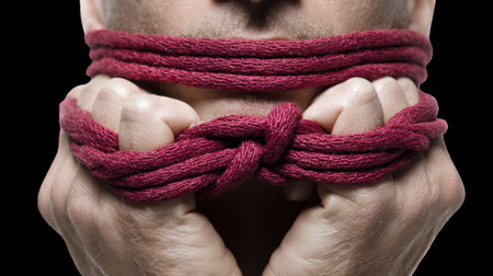 Potent image of a man's bound hands, representing censorship, control, and the stifling of truth.