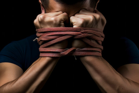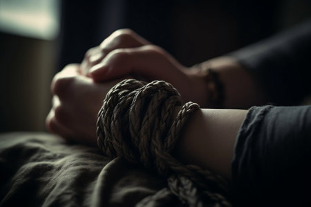 An AI generated illustration of hands tied in ropes in a dark-lit room