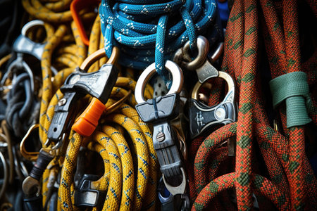 close-up of climbing equipment: carabiners, rope, and harness