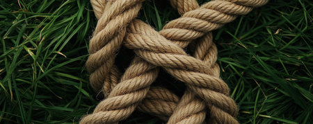 Close-up of intertwined rope on green grass, texture and strength concept