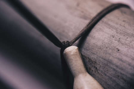 Knot from red rope of taiko drums o-kedo close up background. Musical instrument of Asia.