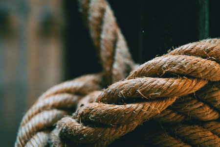 A detailed close-up of a knot in a rope, with a soft bokeh background creating a sense of depth and texture