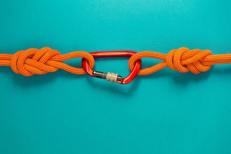 Red carbine with clutch. Equipment for climbing and mountaineering. Safety rope. Knot eight.