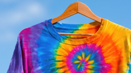 Colorful Tie Dye T-Shirt Hanging on Wooden Hanger Against Blue Sky