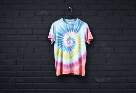 A colorful tie-dye T-shirt hangs on a black brick wall.