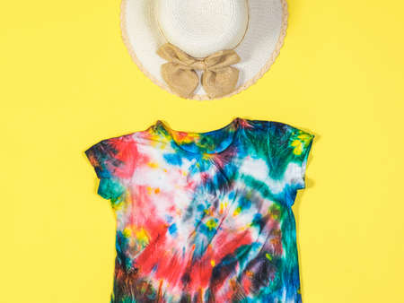 A sun hat and tie dye t-shirt on a yellow background. White clothes painted by hand. Flat lay.