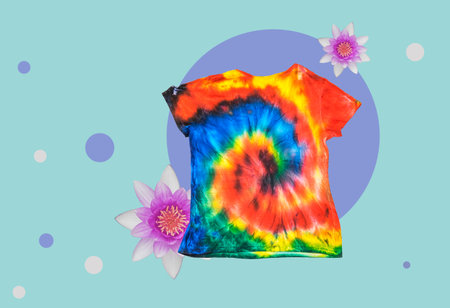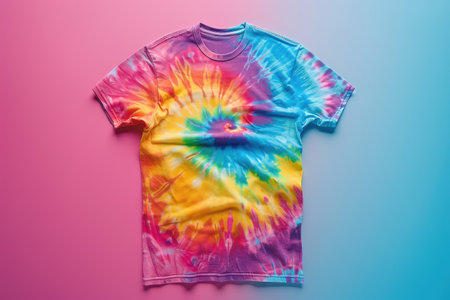 Bright multicolored tie dye T-shirt on an abstract background. Minimal fashion concept. flat lay.