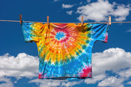 Colorful Tie-Dye T-Shirt Drying on Clothesline Against Blue Sky with Clouds