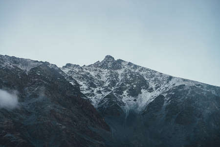 Dark atmospheric landscape with high black rocky mountain top with snow in cloudy sky. Dramatic mountain landscape with snow peaked top in haze in overcast weather. Gloomy view to awesome rocks in fog