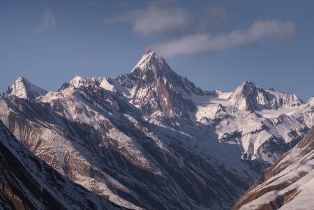 Alpine landscape with high snowy mountain with peaked top under cirrus clouds in sky. Atmospheric view to big snow covered mountains in sunshine. Black rocks and white-snow pointy peak in sunlight.