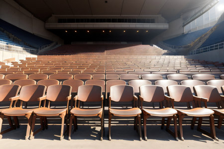 Close-up of empty bleachers in a stadium, soft lighting, with copy space for message or branding