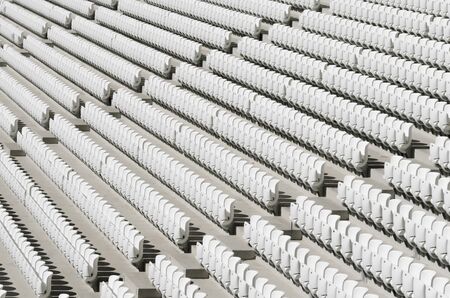 Rows of white empty plastic seats in a stadium.