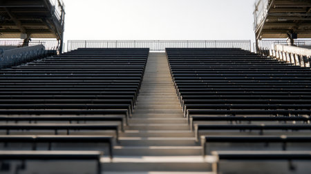A captivating view of empty stadium bleachers leading upward, showcasing architectural design and symmetry under a clear blue sky. Ideal for sports or event imagery.