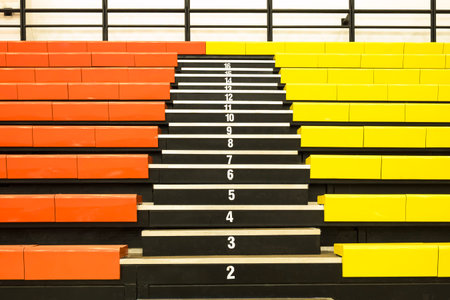 Rows of empty colorful orange and yellow stadium seats with numbers on steps. Indoor sports arena bleachers or grandstand background for spectators. front view with copy space